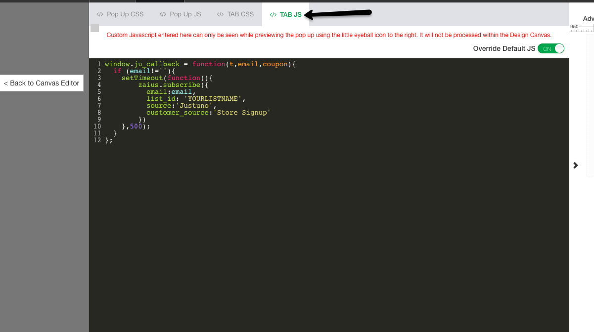 Step 2: In the Tab JS section, paste in the code below after you replace the list id name with the list you want to send emails t
