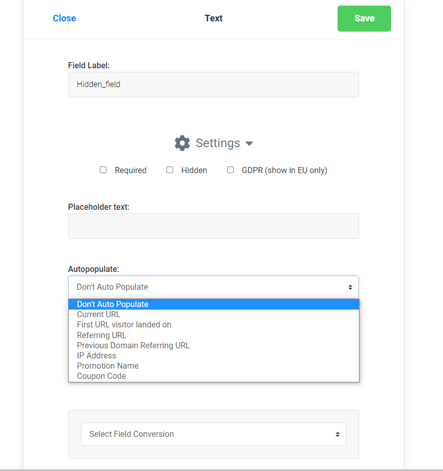 - Once this has been added, you can select the "eye" icon and this will make the field not visible on the front end for the user to see.