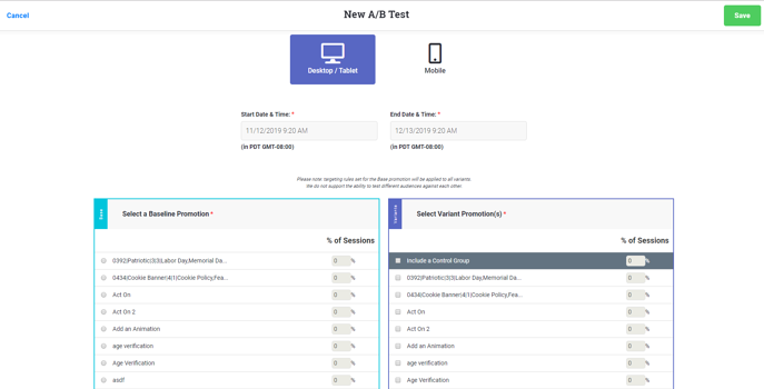 - Once each promotion is updated, head into your A/B testing area and create a test. To learn how to do so please reference this article.